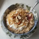 - Serve: Spoon the prepared oatmeal into bowls. Top with the remaining sliced almonds and fresh fruit of your choice.