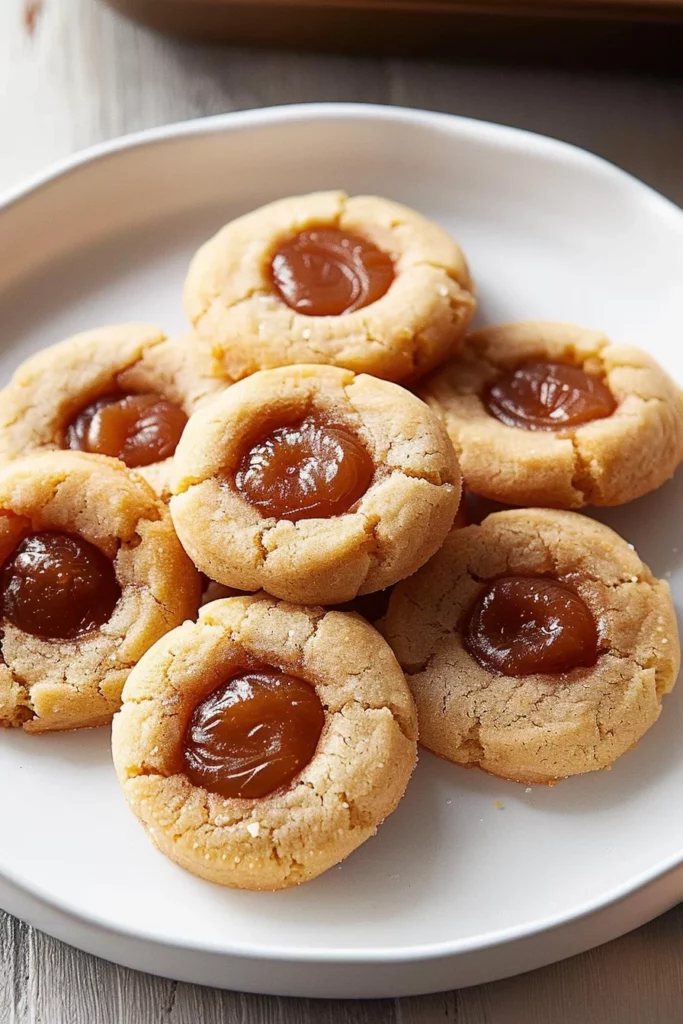 Serve your Apple Butter Thumbprint Cookies on a decorative platter, perhaps with a side of coffee butter cookies for variety. These cookies make a charming addition to any dessert table, particularly during the holiday season or at family gatherings.
