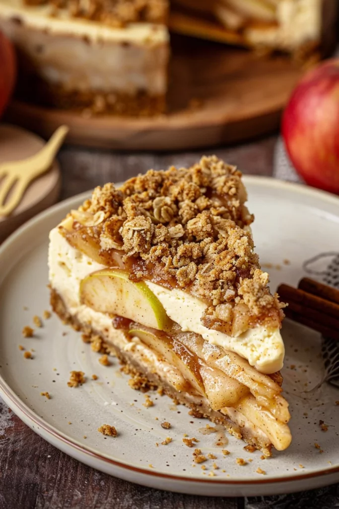 Once your Apple Crumble Cheesecake is fully set, it’s time to present your culinary masterpiece. Carefully remove it from the springform pan and place it on a serving platter. For an elegant touch, garnish with fresh apple slices or a sprinkle of cinnamon powder.