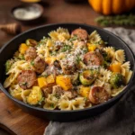 A delicious and comforting dish that combines smoked sausage, roasted butternut squash, and Brussels sprouts with bow tie pasta, perfect for chilly autumn evenings.