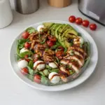 A colorful and healthy baked marinated chicken salad featuring chicken breasts, fresh avocados, mozzarella balls, and a tangy balsamic vinaigrette.