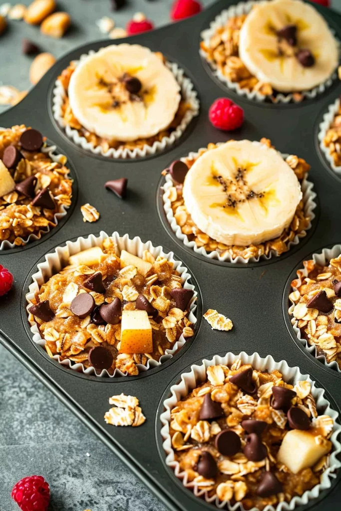 Keywords: baked oatmeal cups, banana chocolate chip, almond butter apple, blueberry almond muffins, peanut butter banana