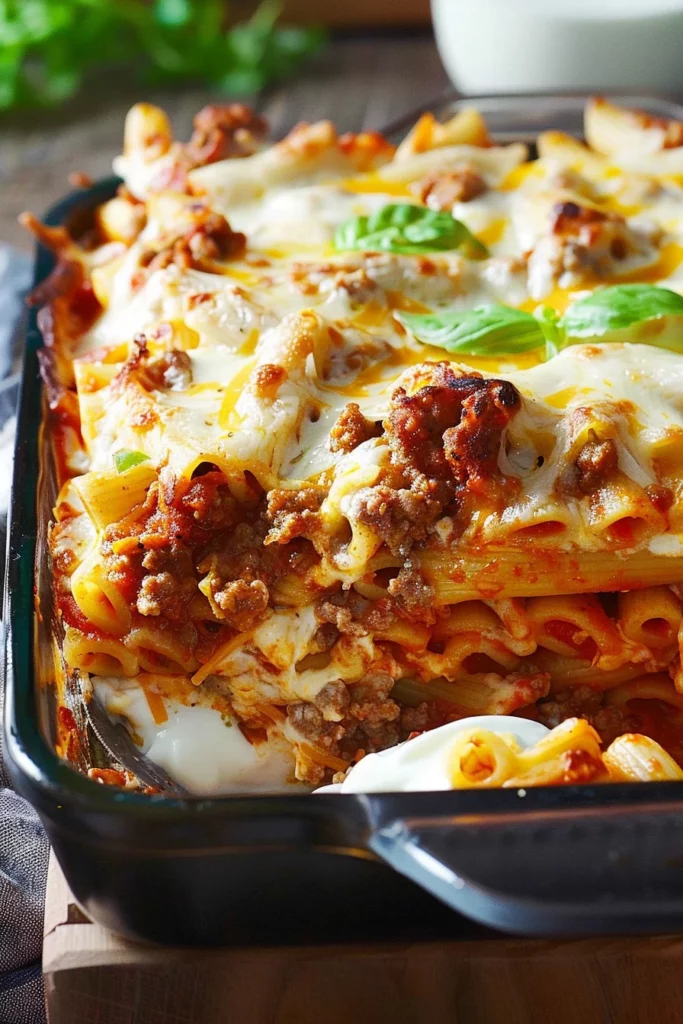Keywords: baked ziti recipe, cheesy pasta bake, creamy beef casserole, homemade ziti dish, oven-baked pasta