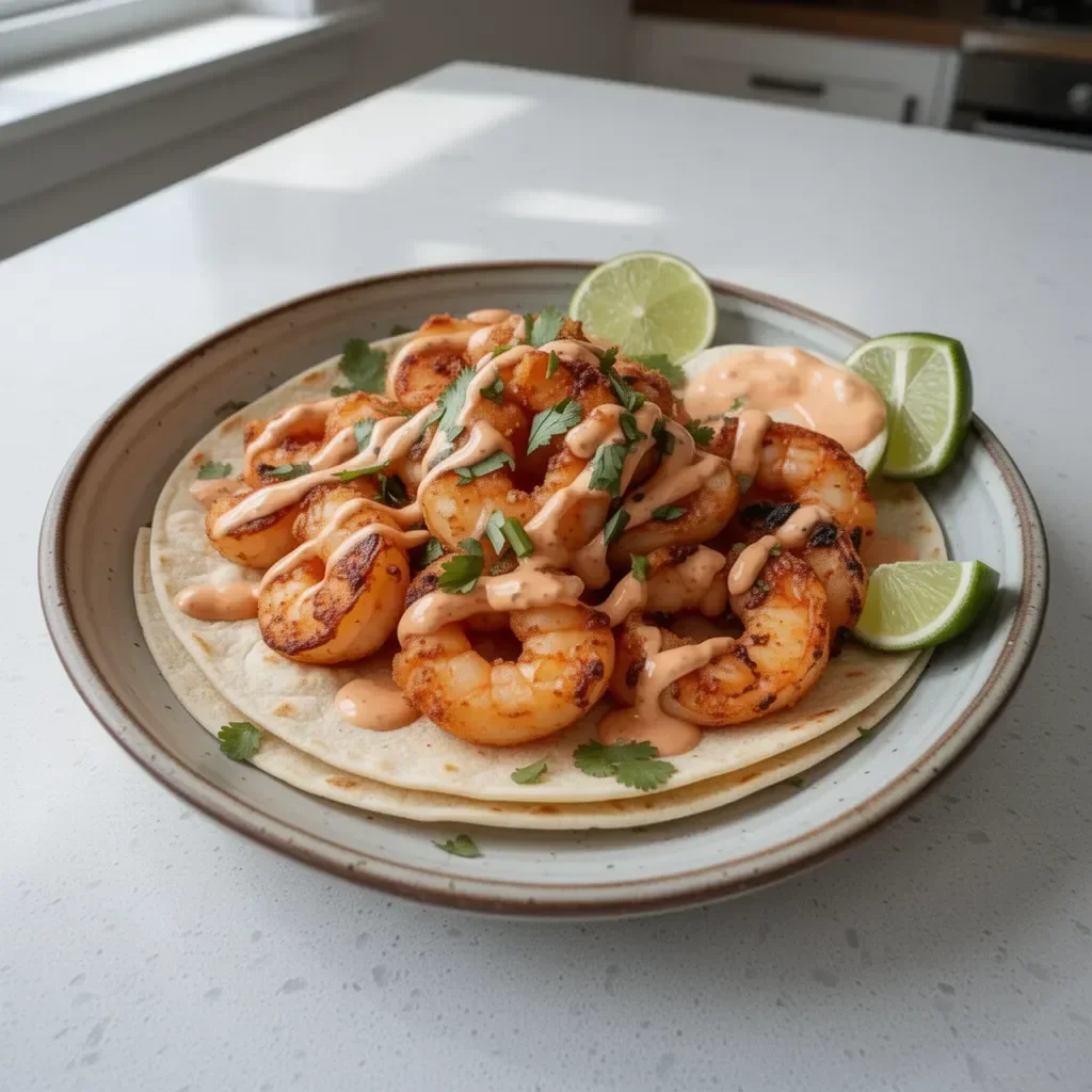 Crispy shrimp paired with a zesty bang bang sauce, served in warm tortillas for a delightful dining experience.