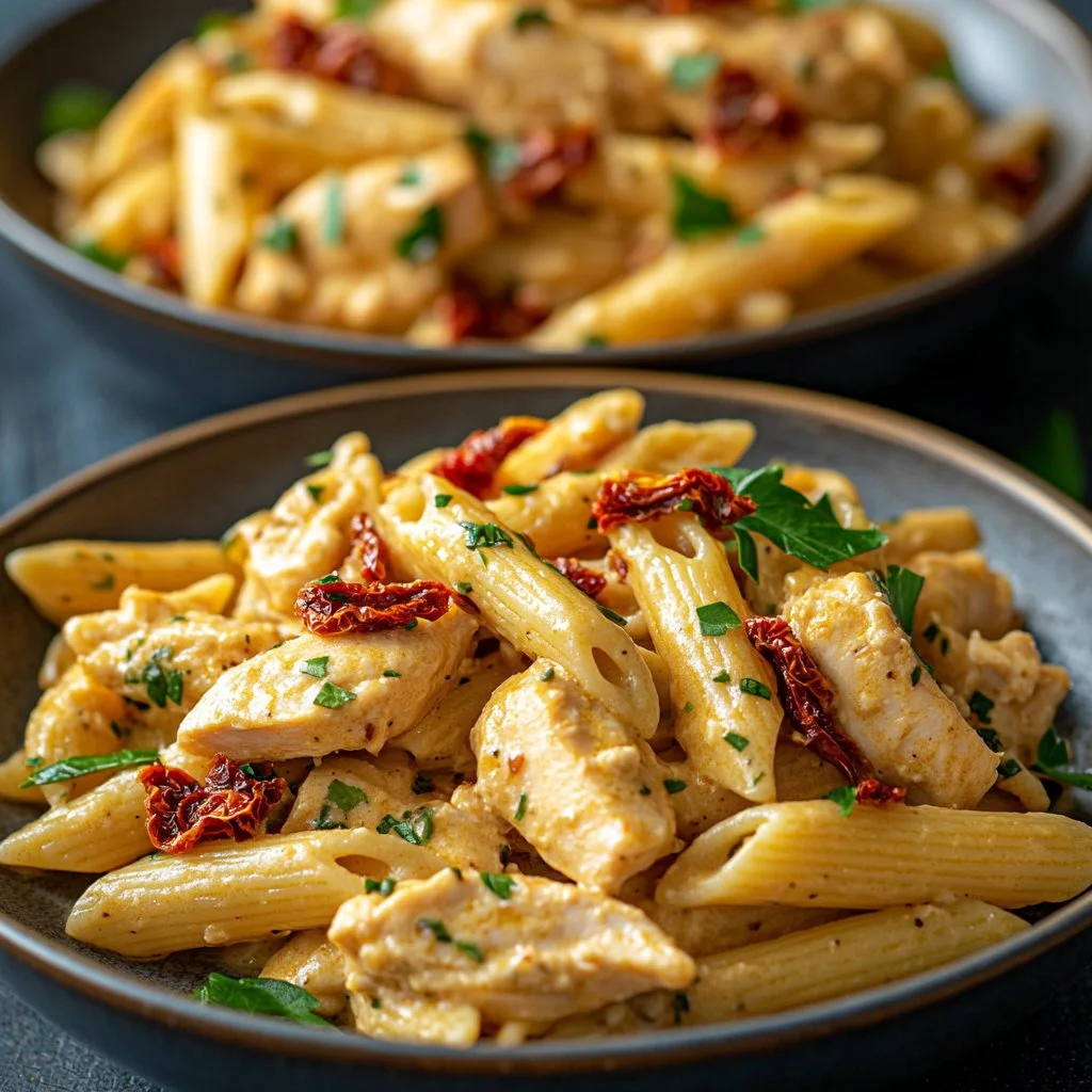 A delightful chicken pasta dish with creamy sauce, sun-dried tomatoes, and rich flavors that brings comfort and warmth.