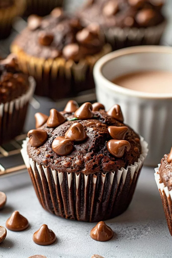 The visual appeal of these muffins lies in their rich color and the contrasting chocolate chips on top. This presentation makes them a tempting addition to any dessert table or brunch spread.