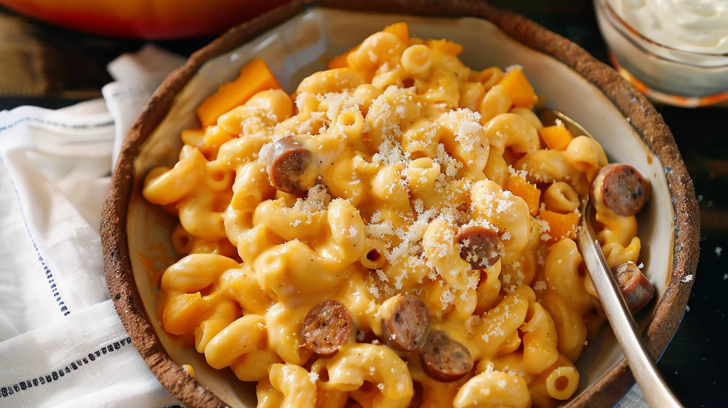 Keywords: butternut squash, mac and cheese, creamy pasta, baked squash, cheesy pasta, sausage and cheese