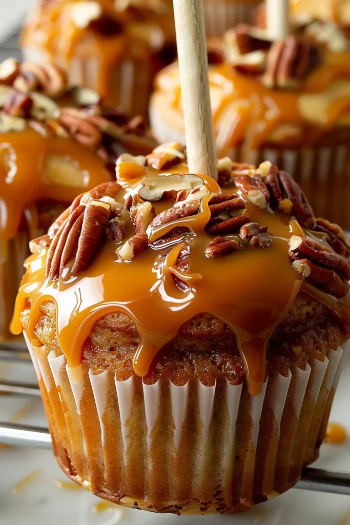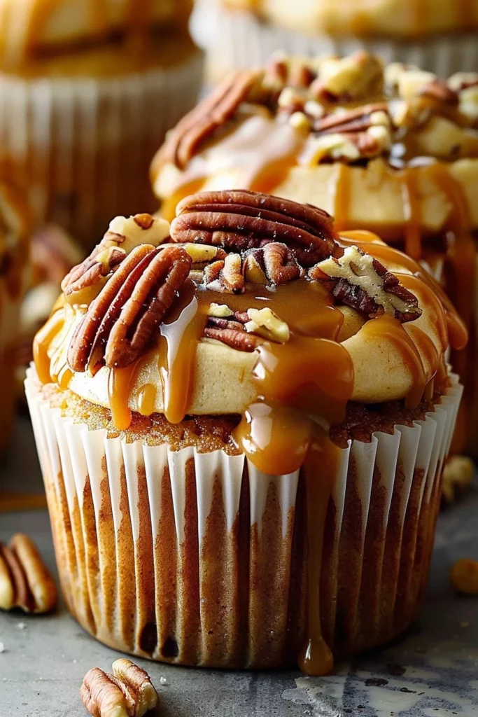 Arrange the cupcakes on a platter, allowing the caramel to glisten under the light. This simple presentation highlights the rich caramel topping and the toasted pecans, inviting guests to indulge in a sweet treat.