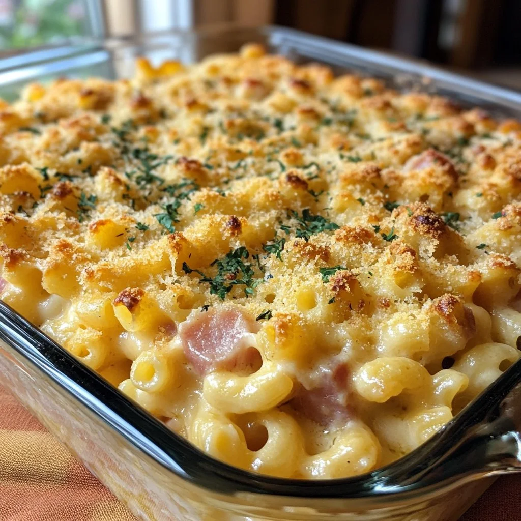 A comforting and nostalgic dish combining macaroni, cheese, and ham, baked to perfection with a creamy sauce and crunchy topping.