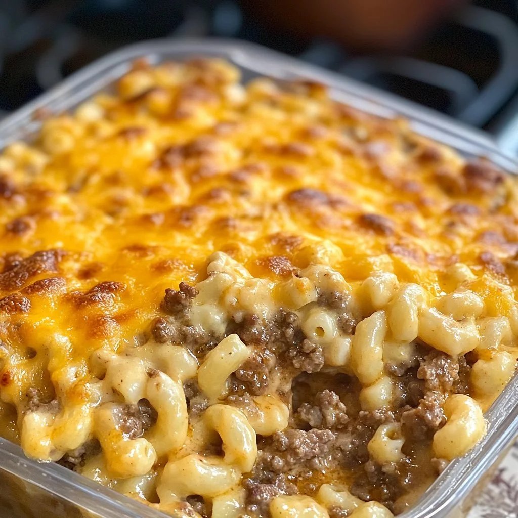A comforting cheeseburger casserole made with ground beef, pasta, and melted cheddar cheese.