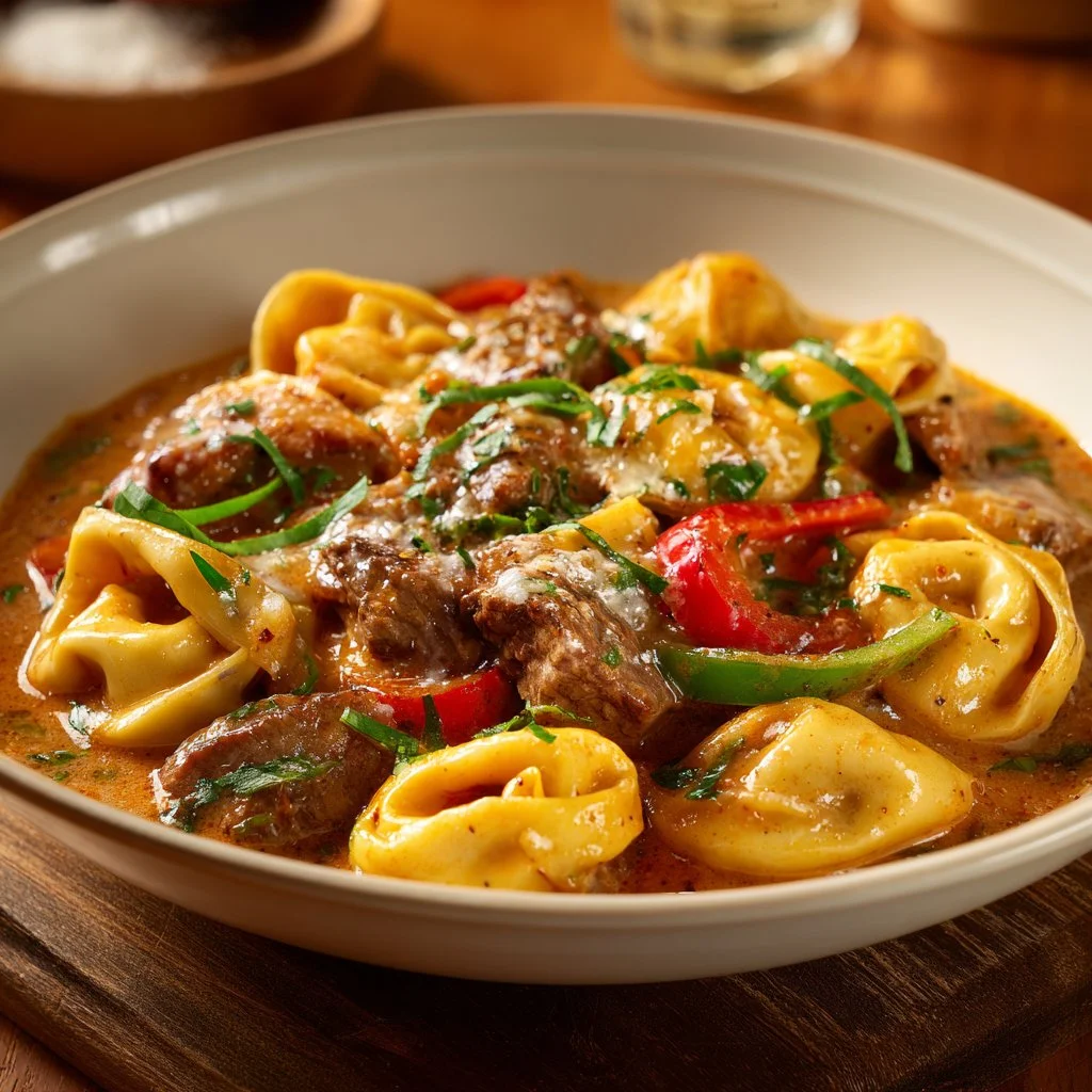 A delightful pasta dish that transforms the classic cheesesteak into a comforting bowl of tortellini coated in a rich provolone sauce.