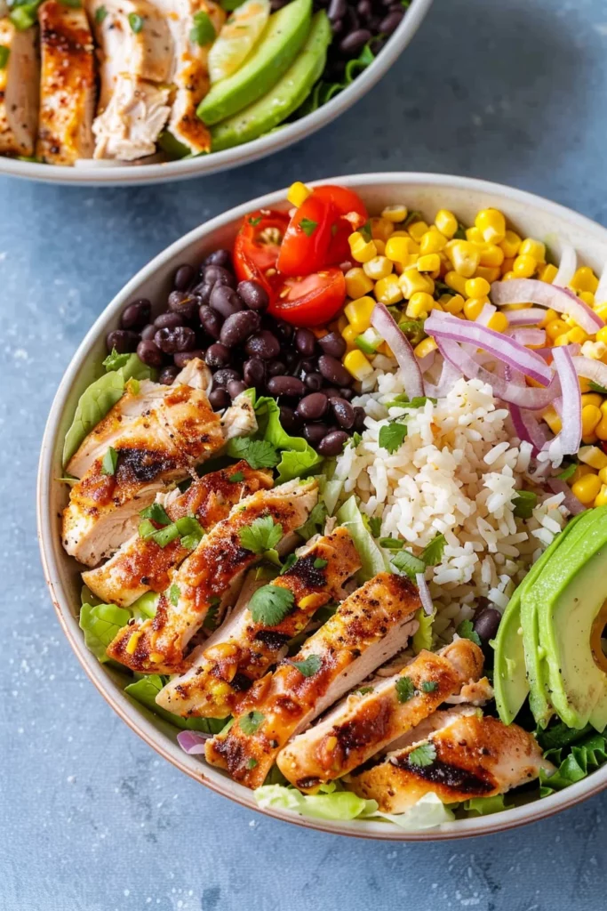 Achieving perfection with Chicken Burrito Bowls involves attention to detail. When assembling, start by layering the lime-infused rice and chopped romaine lettuce at the bottom of your serving dish. This foundation provides a balance of flavors and textures, setting the stage for the rest of the ingredients.