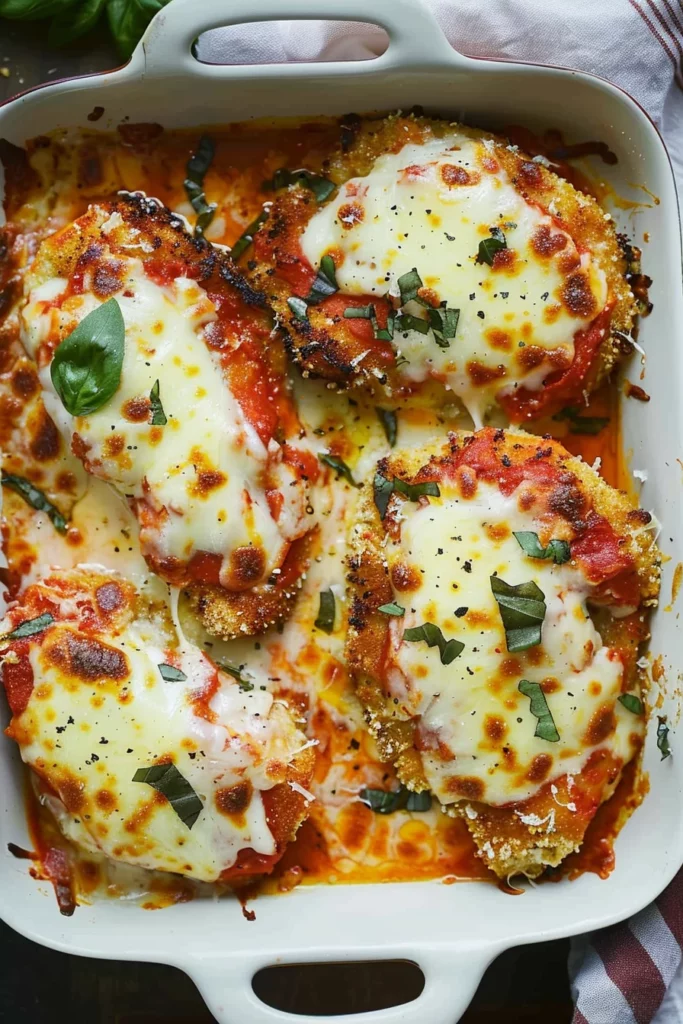 The technique for making Chicken Parmesan involves both frying and baking. After frying the chicken, transfer it to a baking dish and top each piece with tomato sauce, mozzarella, fresh basil, and beef cheese. This layering not only adds depth of flavor but also creates a visually appealing dish that is as delightful to look at as it is to eat.