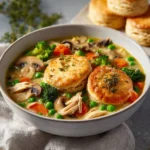 A comforting chicken pot pie soup filled with tender chicken, vegetables, and a creamy broth, perfect for chilly evenings.