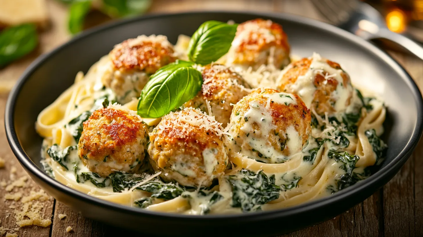 Creamy Alfredo meatballs served over perfectly cooked pasta, combining rich flavors and comforting textures in a classic Italian-inspired dish.