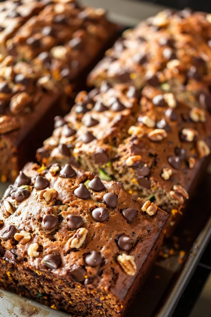 Zucchini brings moistness and a subtle earthiness that complements the sweetness of the sugar and the richness of the chocolate chips. Orange zest introduces a citrusy brightness that elevates the flavor profile, making each bite of this Golden Chocolate Chip Zucchini Bread memorable.