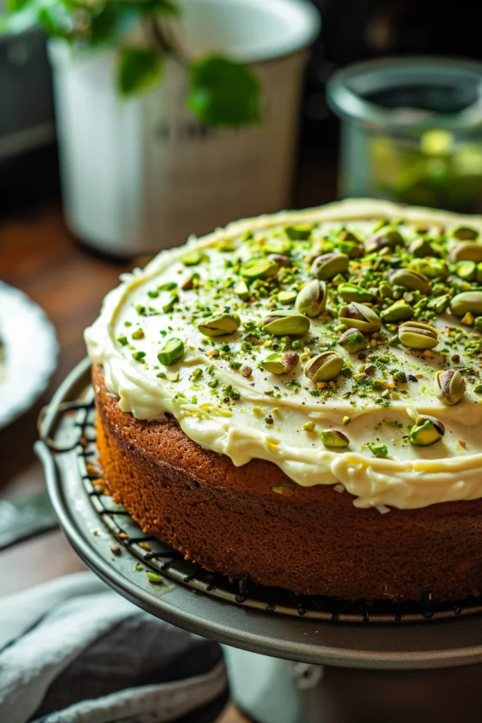 Finish the cake by garnishing with roughly chopped pistachios and lime zest. These final touches add visual appeal and enhance the cake’s texture and flavor. The contrast of creamy topping, crunchy pistachios, and vibrant lime creates a symphony of textures and tastes that make this Courgette and Lime Cake truly unforgettable.
