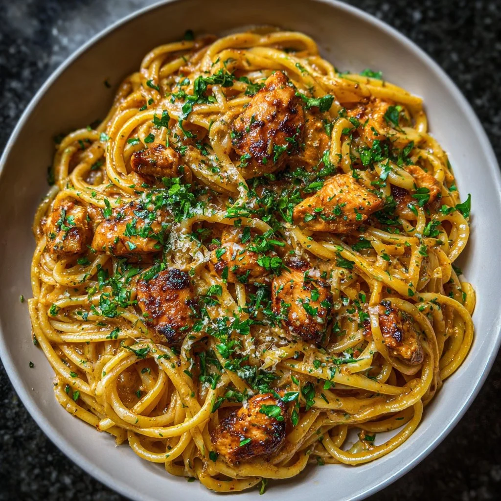 A comforting yet exciting dish featuring tender chicken, aromatic garlic, and delightful spices mingled with linguine.