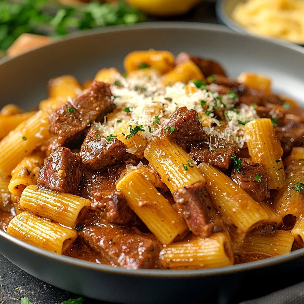 A rich and savory pasta dish featuring tender ribeye steak, creamy cowboy butter, and rigatoni, perfect for cozy gatherings.