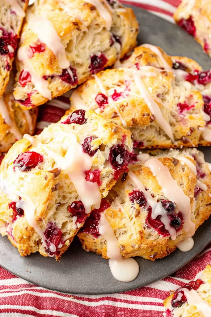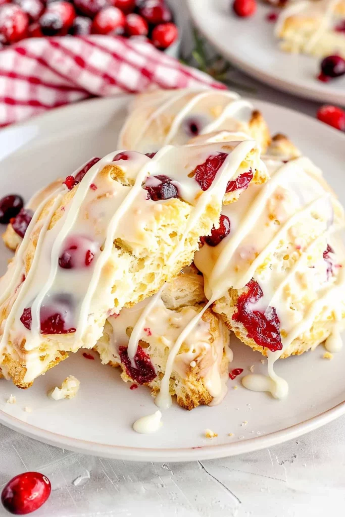 Fresh cranberries and white chocolate chips are the stars of this recipe, providing a balance of tartness and sweetness. Meanwhile, buttermilk and vanilla extract add moisture and flavor, ensuring each bite is as delicious as the last. Finally, a simple glaze made from icing sugar and milk adds a finishing touch, enhancing the scones’ appeal.