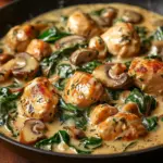 Keywords: chicken skillet, creamy mushroom dish, spinach recipe, comforting meals, quick dinner