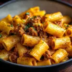 Now it’s time to add the rigatoni. Toss the cooked pasta into the sauce, adding half a cup of the reserved cooking water as needed for the right consistency. Adjust the seasoning and finish with chopped parsley for a touch of freshness. Enjoy!