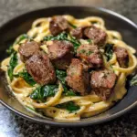 A rich and creamy linguine pasta dish featuring tender steak bites and fresh spinach, perfect for family gatherings.
