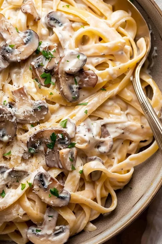Keywords: – Mushroom pasta, – Creamy fettuccine, – Vegan parmesan, – Garlic mushrooms, – Coconut cream pasta, – Dairy-free pasta