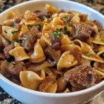 A comforting meal featuring tender beef stewed in flavorful broth, served over egg noodles, embodying warmth and nostalgia.