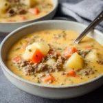 A heartwarming soup blending ground beef, creamy cheeses, and fresh vegetables, perfect for chilly nights.