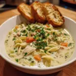 A warm and comforting bowl of Crockpot Creamy Chicken Noodle Soup, perfect for chilly winter nights. This hearty soup features shredded chicken, tender noodles, and a rich, creamy sauce.