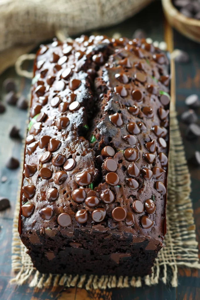 The bread’s rich, chocolatey appearance, accented by the glossy chocolate chips on top, makes it an attractive centerpiece for any table. Whether you’re serving it to guests or enjoying it solo, this bread is sure to impress with its taste and visual appeal.