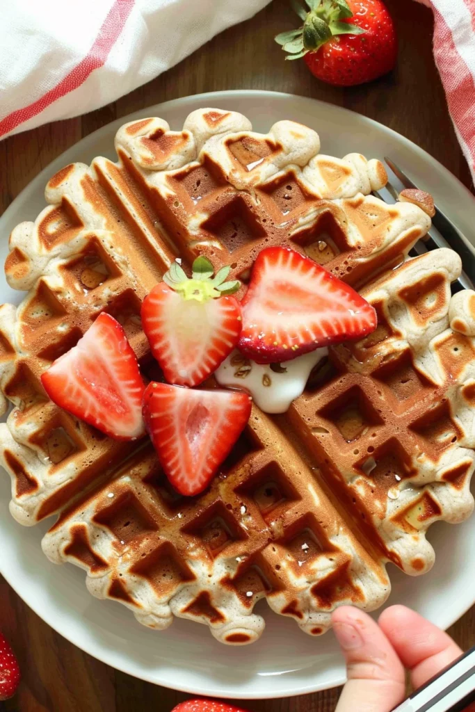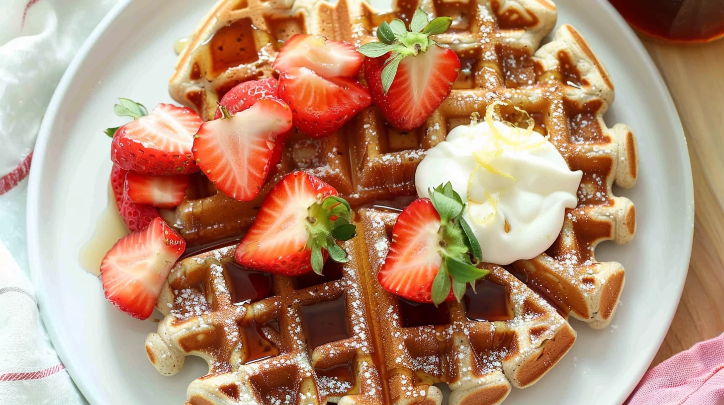 Keywords: whole wheat waffles, strawberry waffles, Greek yogurt waffles, lemon zest waffles, maple syrup waffles