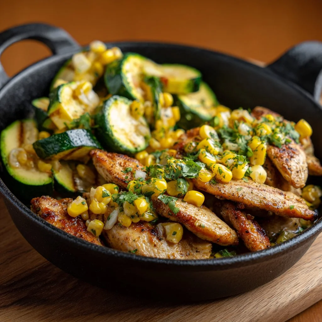 A delicious and nutritious dish combining juicy chicken breasts, fresh zucchini, and sweet corn, cooked in garlic butter for a satisfying meal.