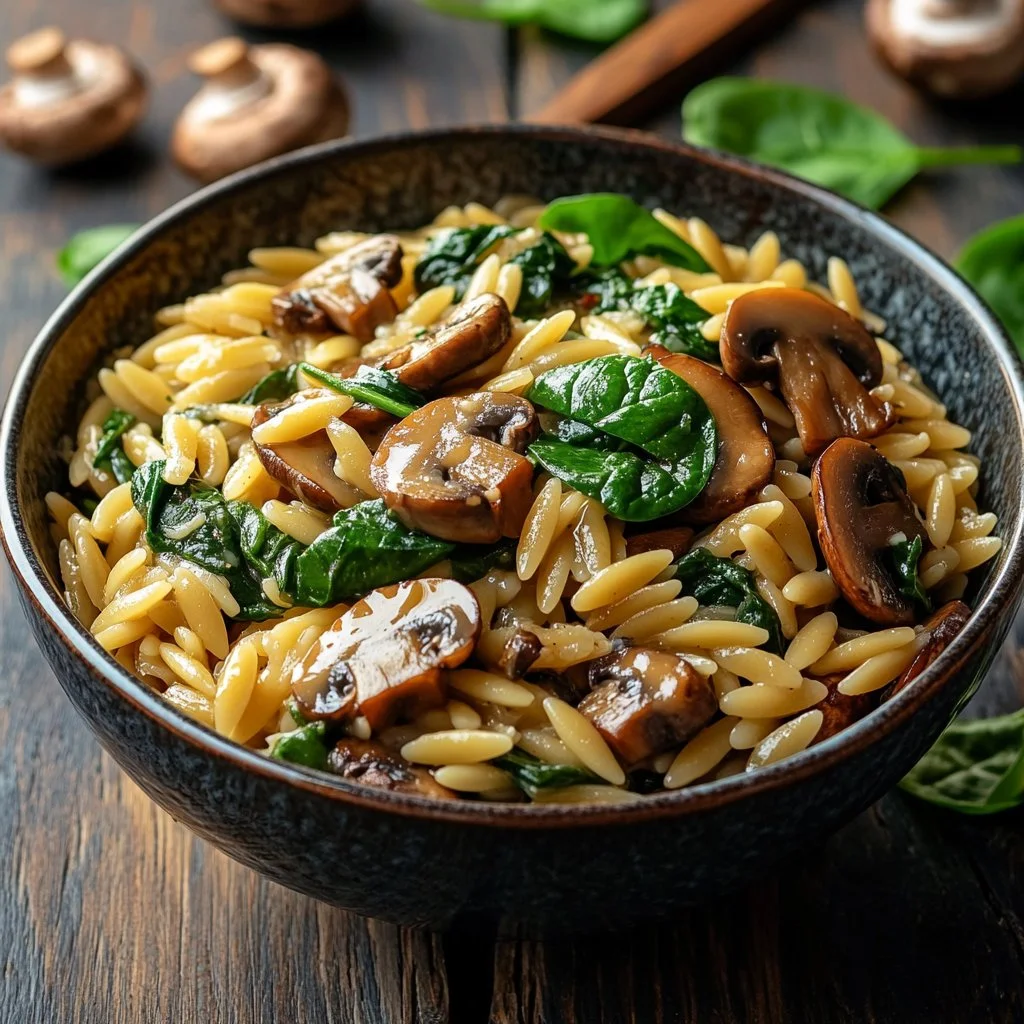 A comforting dish featuring creamy orzo, sautéed mushrooms, and fresh spinach, infused with garlic and spices.