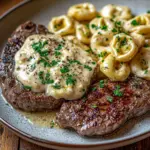 A comforting dish blending rich garlic butter steak with creamy, cheesy Alfredo tortellini, perfect for family gatherings.