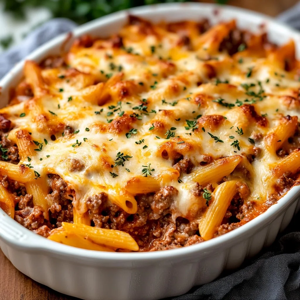 A comforting and hearty ground beef casserole baked with pasta, diced tomatoes, and creamy sauce, perfect for family dinners.