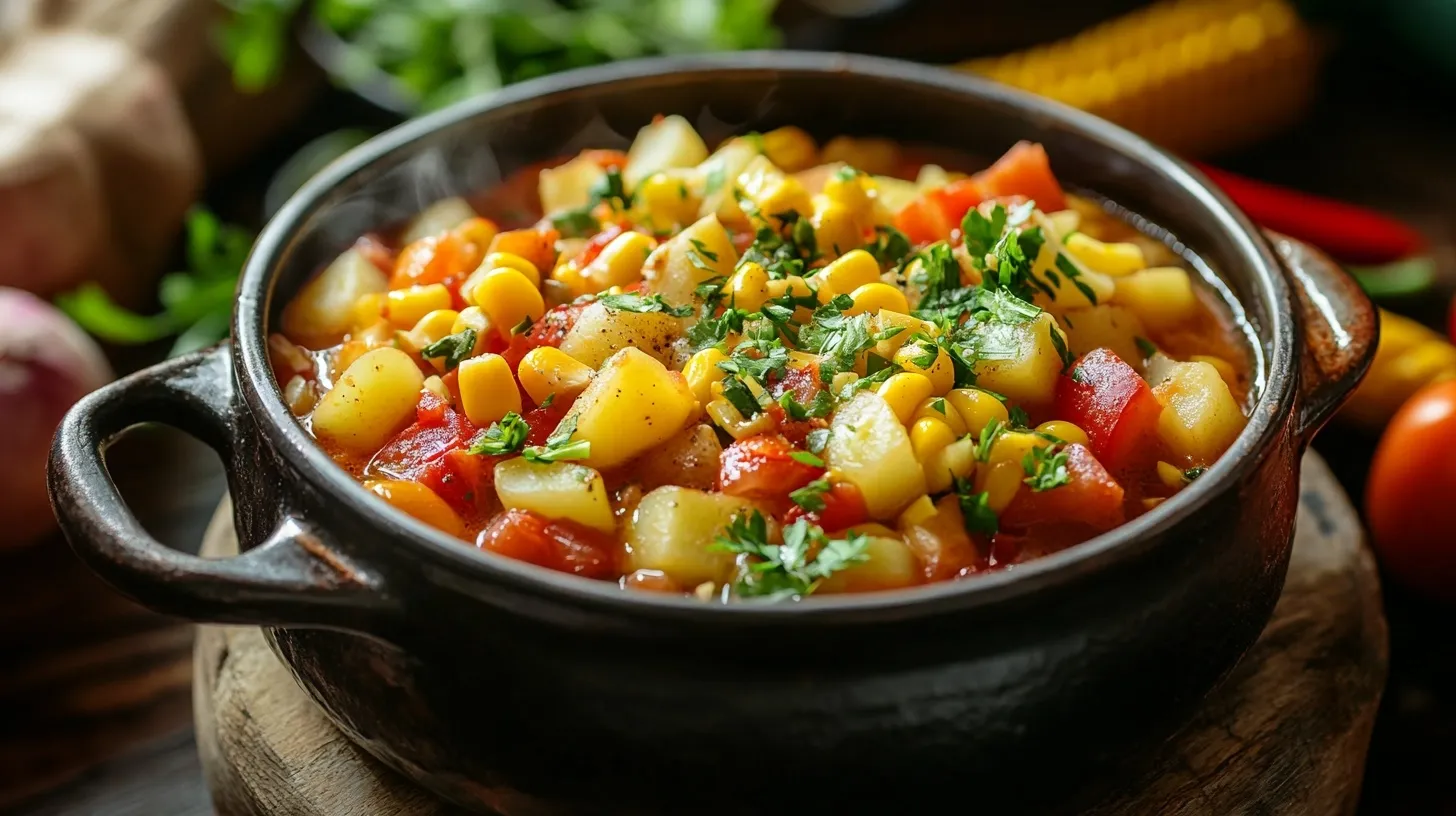 A hearty Mexican corn stew (guiso de maiz) featuring fresh vegetables and robust seasonings in a flavorful broth.