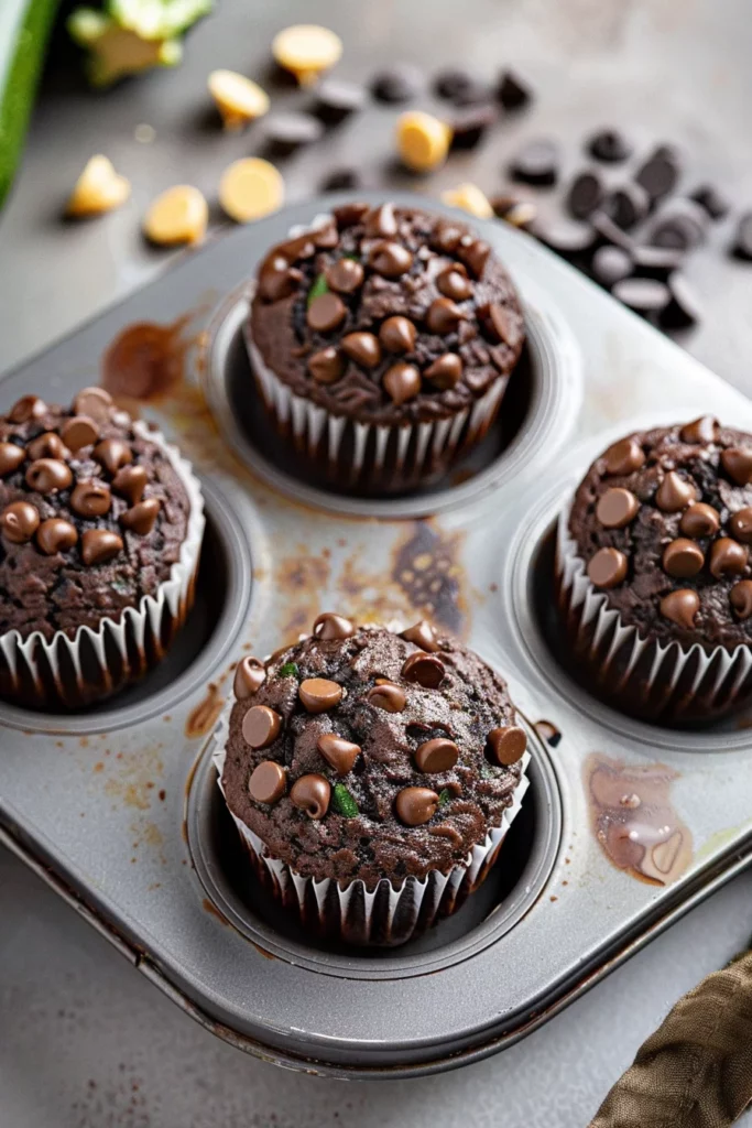 Serve your healthy and moist chocolate zucchini muffins warm or at room temperature. The melty chocolate chips and tender crumb make them an irresistible treat. For a touch of elegance, dust them lightly with powdered sugar or drizzle with a bit of melted chocolate before serving.