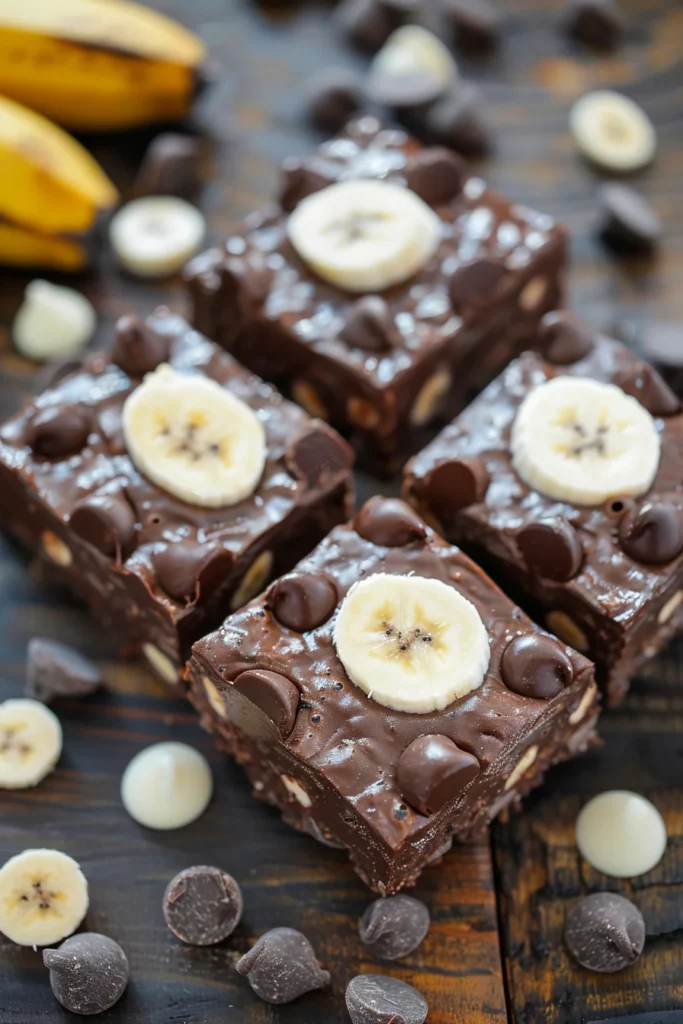 Keywords: 1. Chocolate Banana Bars, 2. No Bake Fudge, 3. Healthy Cookie Recipe, 4. Yogurt Fudge Bars, 5. Easy Chocolate Dessert, 6. Banana Cookie Bars