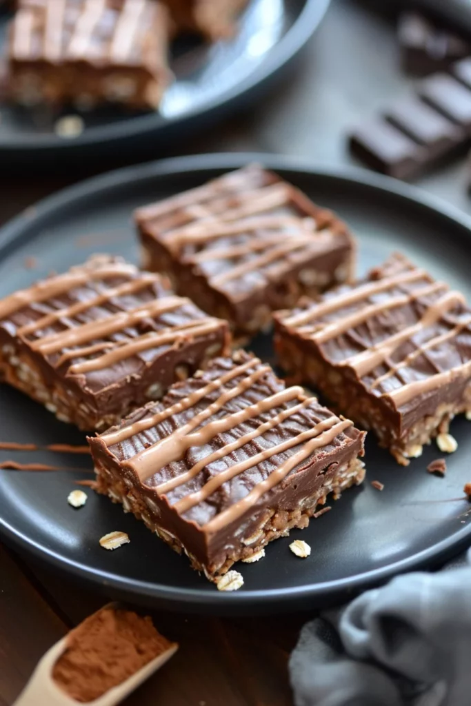 To present your Healthy No Bake Peanut Butter Chocolate Protein Bars With Oat Crust, cut them into even squares using a sharp knife. Clean the knife between cuts for neat edges. Arrange the bars on a serving platter for a visually appealing display.