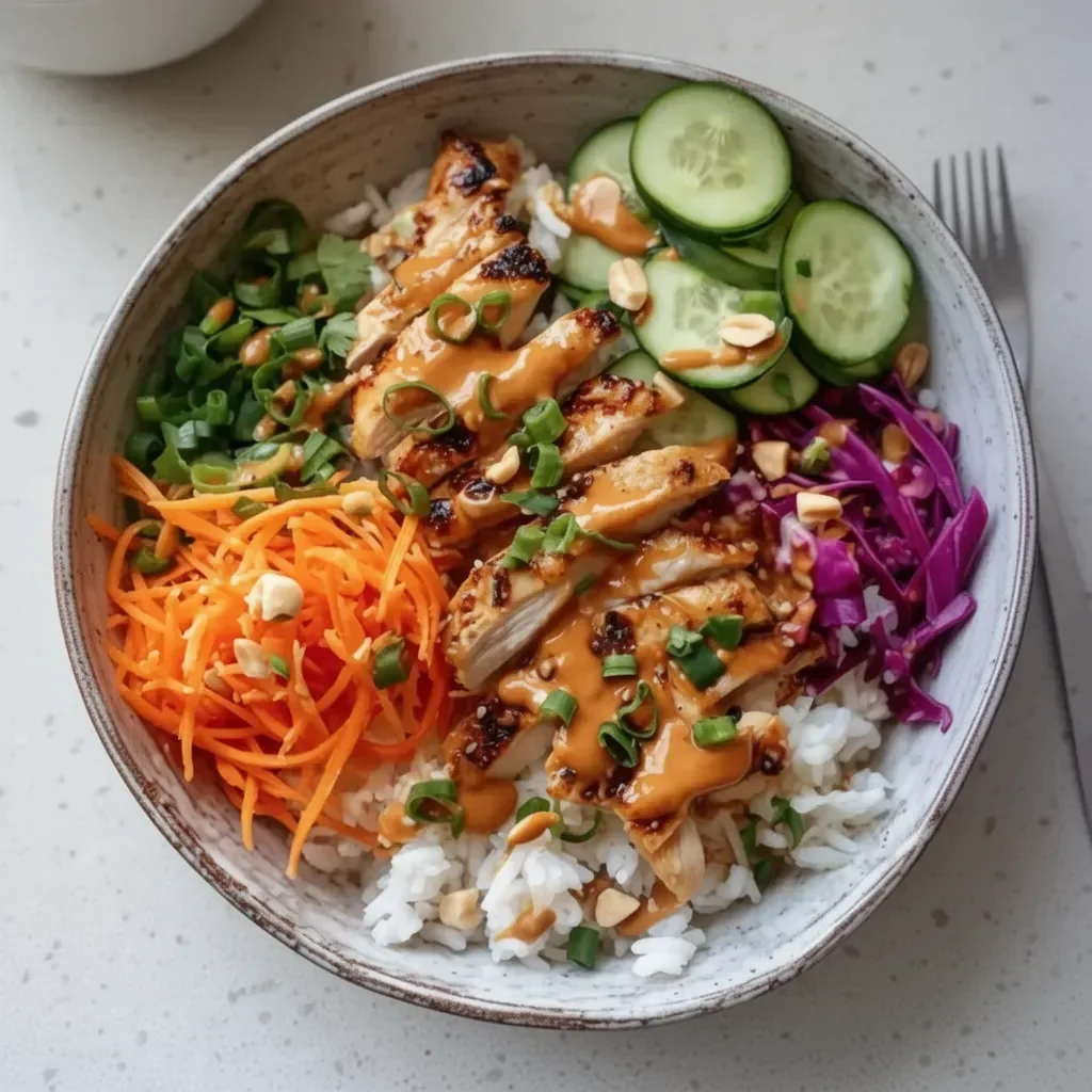 A vibrant bowl of cooked quinoa, tender seasoned chicken, fresh vegetables, and a creamy peanut sauce, perfect for a nutritious meal.