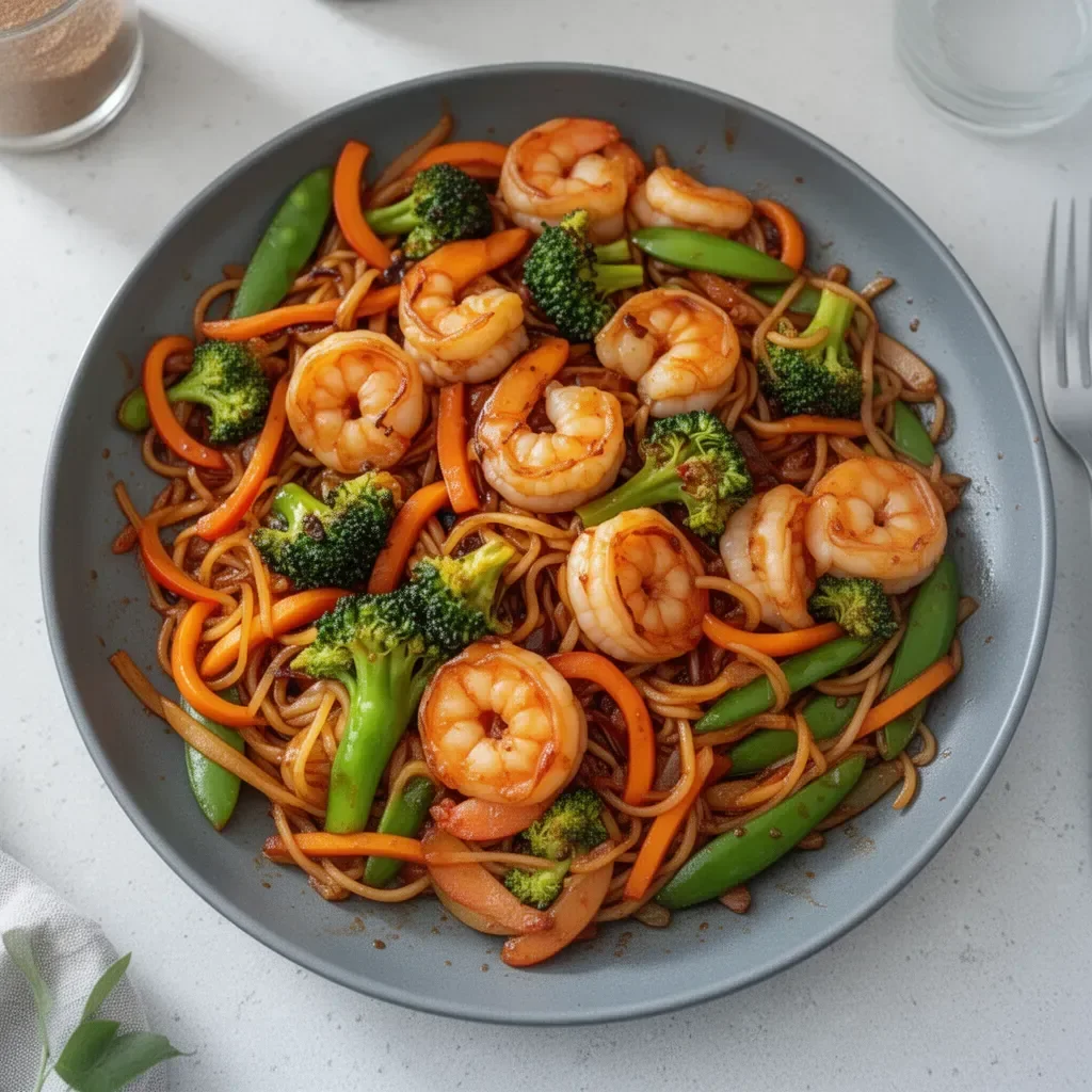 A quick and delicious high-protein shrimp stir fry, combining shrimp, mixed vegetables, and high-protein noodles in one pan.