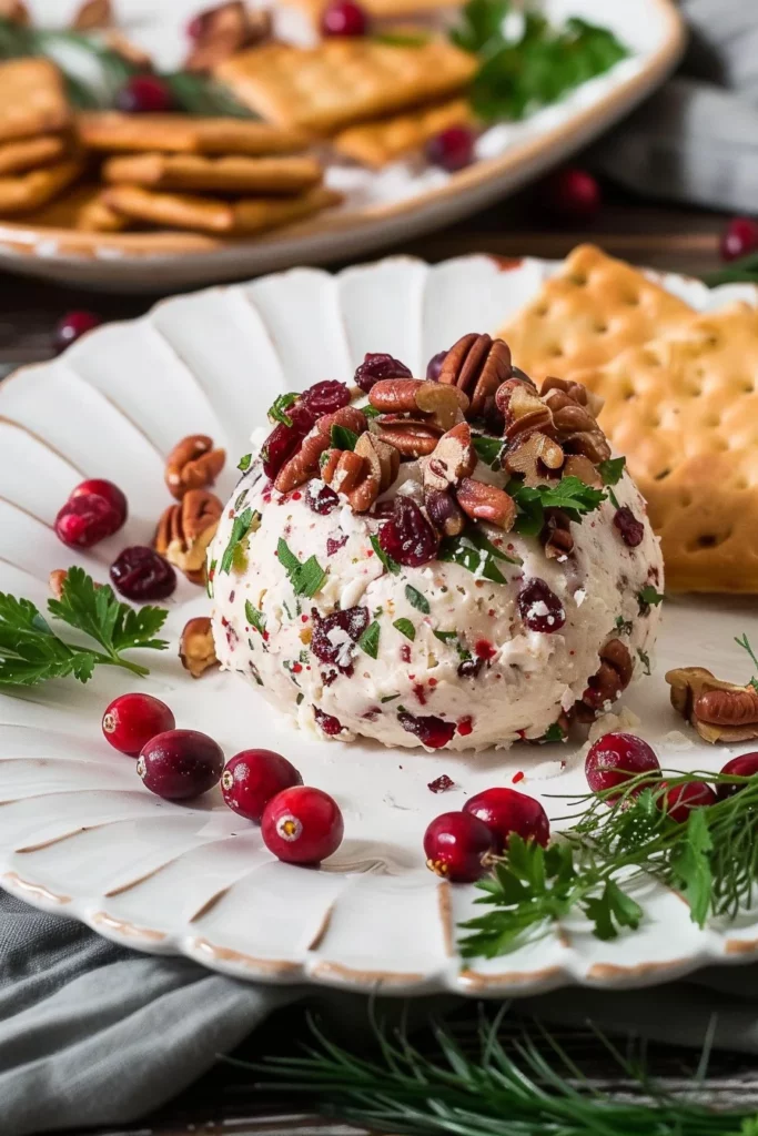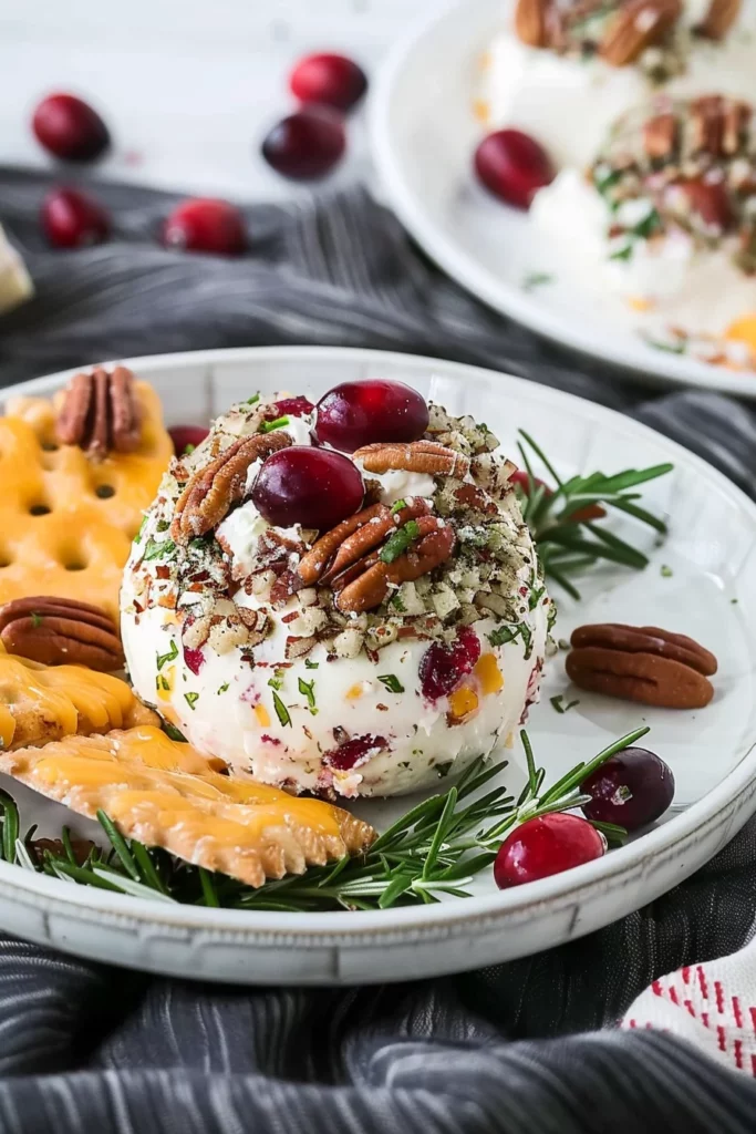 Keywords: cream cheese ball, cranberry pecan appetizer, holiday cheese ball, savory cheese ball, festive party snack, rosemary cheddar ball
