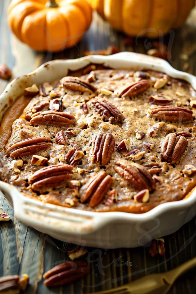 - In another bowl, combine the pecan halves with the sugars, cinnamon, and a pinch of salt. Scatter this blend evenly over the pumpkin mixture.