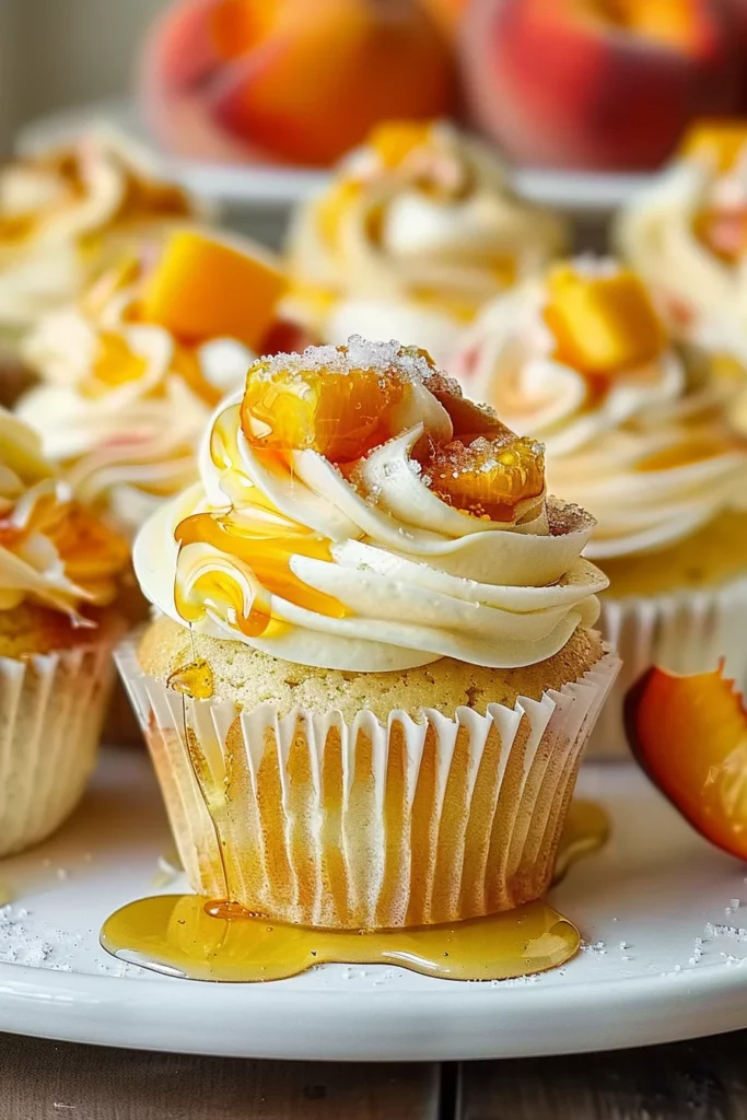 Once your cupcakes have cooled, frost them generously. Top with diced fresh peaches, adding not only a burst of flavor but also vibrant color. Drizzle with honey for an extra layer of sweetness, and finish with a sprinkle of sugar crystals for a sparkling touch.