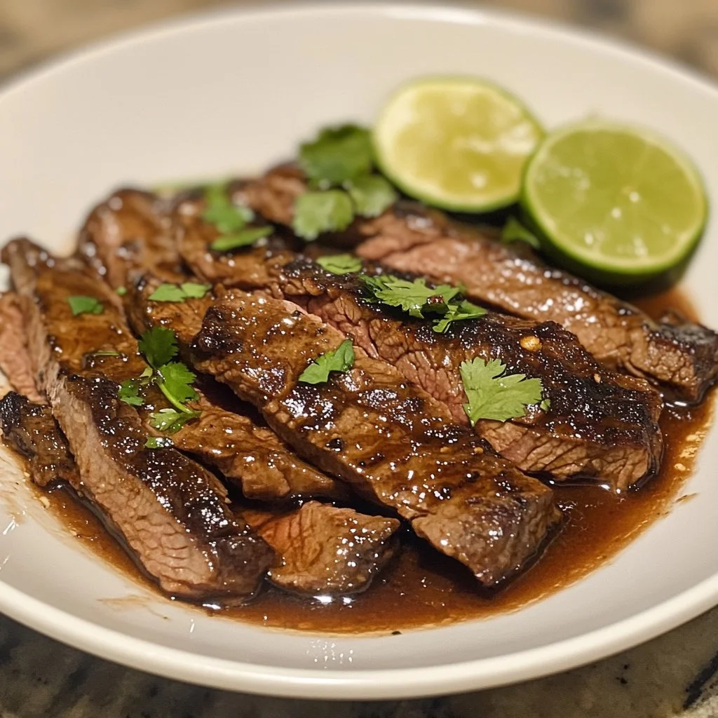 When it’s time to serve, slice the skirt steak into thin strips, showcasing its beautiful colors and texture. Present it on a cutting board, garnished with the chopped cilantro for a fresh pop of color. Use lime wedges for a zesty addition that guests can squeeze over their steak.