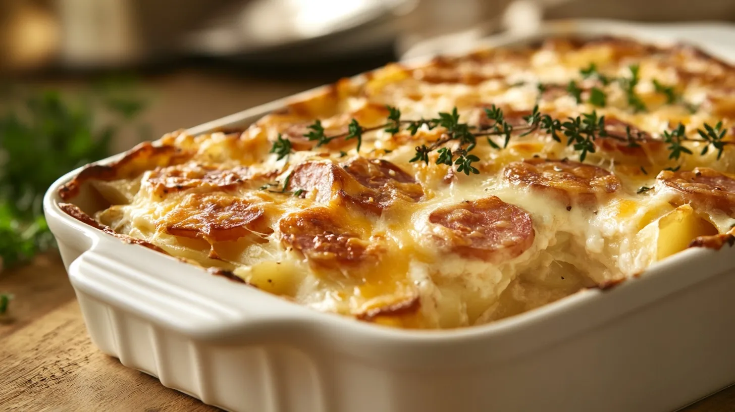A creamy and hearty potato casserole featuring kielbasa, perfect for family dinners and make-ahead meals.