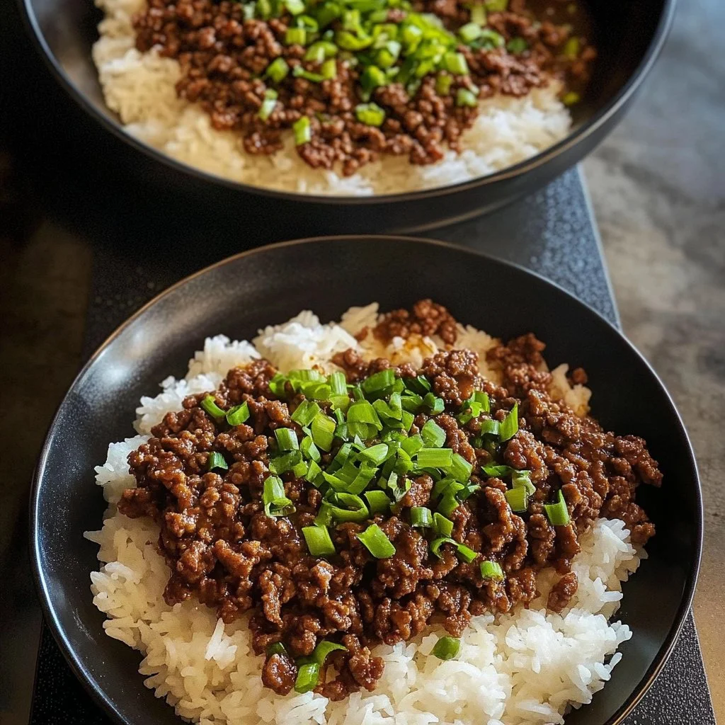 A comforting and flavorful Korean beef bowl featuring ground beef, soy sauce, and aromatic seasonings served over rice.