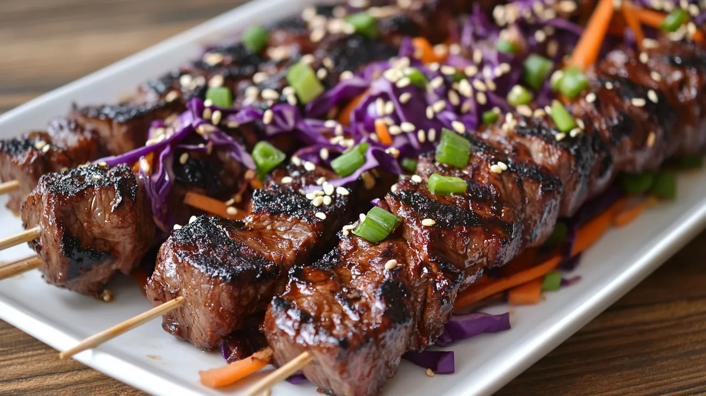 Serving Suggestions of Korean Bulgogi Beef Skewers with Sesame Scallion Slaw